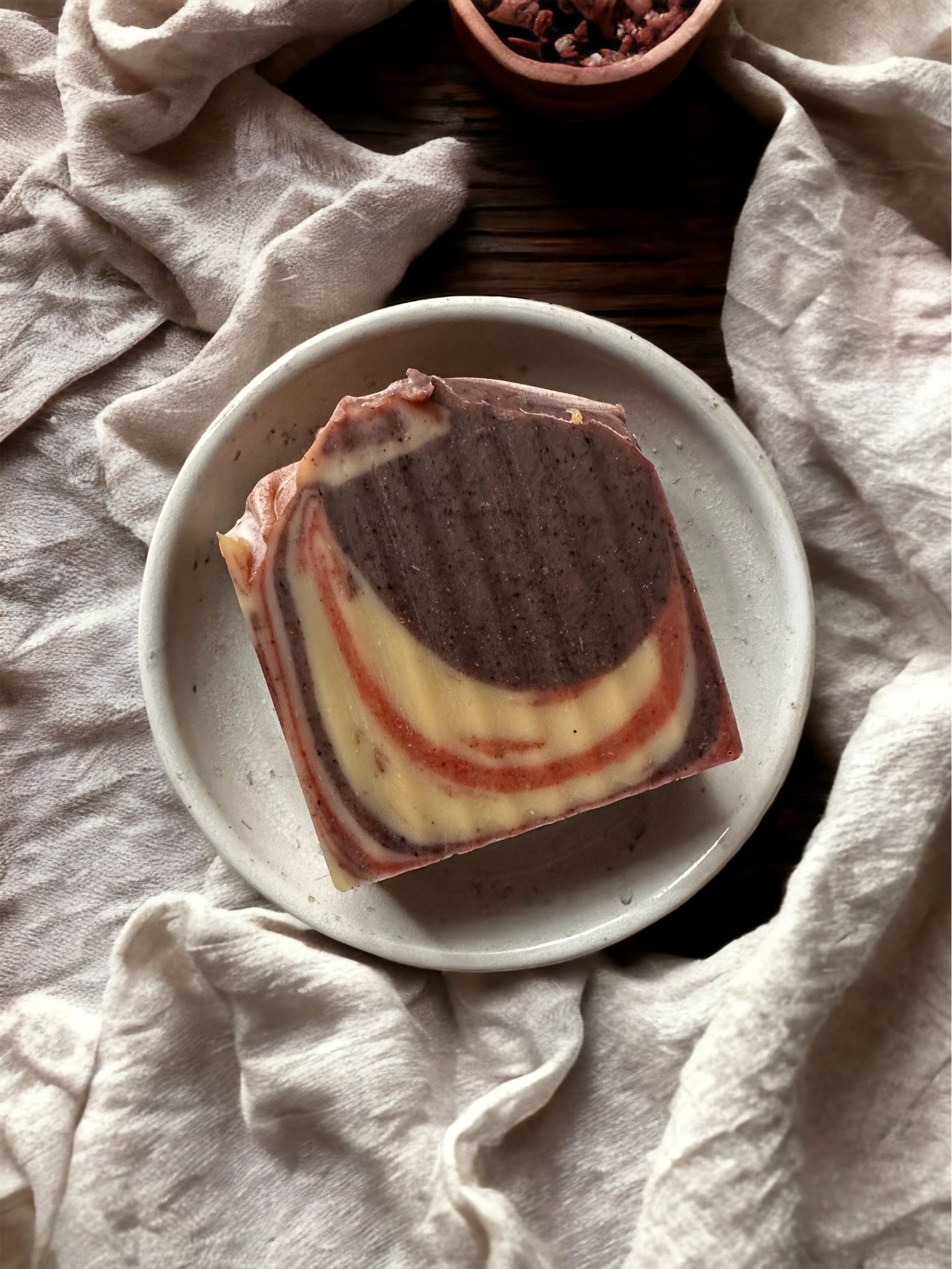 With an abundance of autumn apples from our beloved Apple Hill just up the road, and a moody color palette, we crafted this delectable bar of soap. Colored with natural alkanet root and red Brazilian clay, and infused with real apples, it's scent is reminiscent of a crackling fire and spiced cider. Aromatic notes of red apples, nectar, tart berries, sweet orange, cinnamon, amber, and musk.