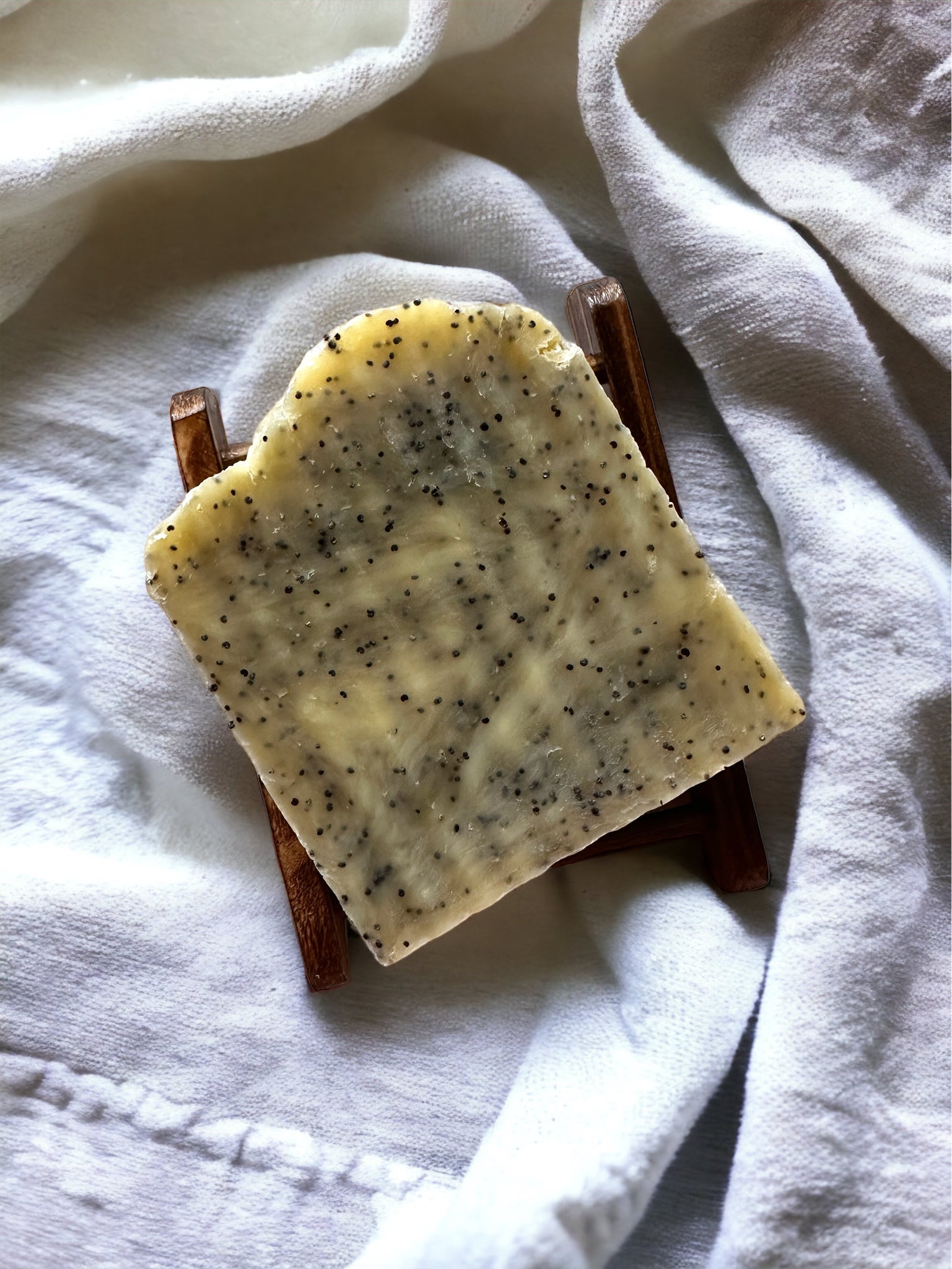 This hot process bar is crafted using high-quality California extra virgin olive oil infused with wildharvested mint geranium (also known as costmary; bible plant) and raw shea butter, imparting a rich, nourishing lather. Homegrown poppy seeds are dispersed throughout, providing a natural, gentle exfoliation. Its aroma is a refreshing blend of sage and spearmint, offering a calming yet invigorating sensory experience. The soap has not been colored, and it has a rustic, hand-cut appearance. The overall look and feel of the soap is one of artisanal craftsmanship, appealing to those who appreciate natural, homemade skincare products. The resulting bar makes for a fantastic kitchen or utility sink addition. Aromatic notes of earthy sage, rosemary, and sweet spearmint.