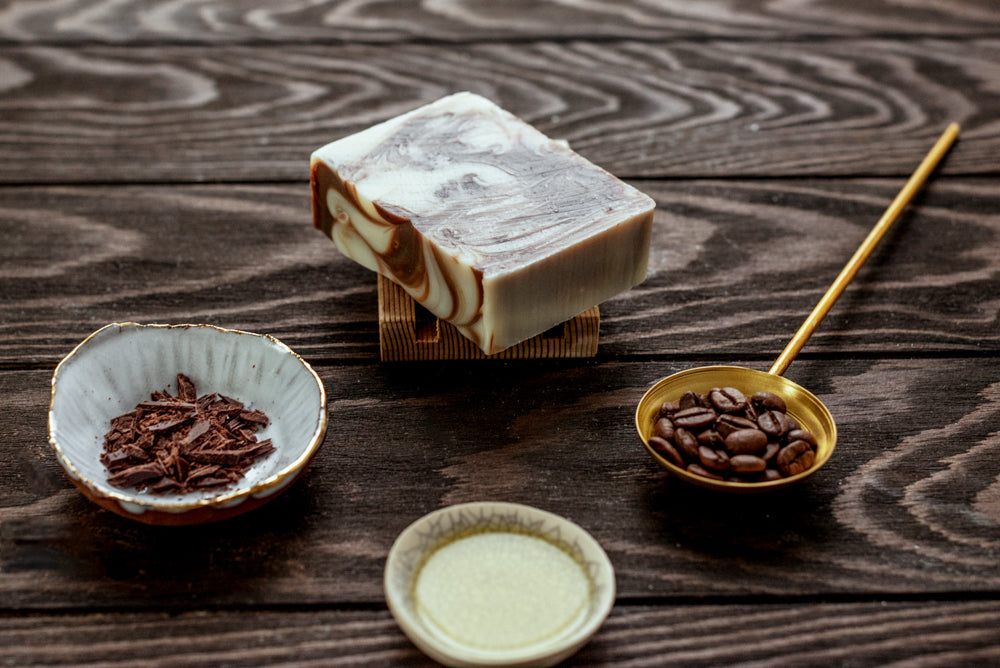 INGREDIENTS: virgin coconut oil*, extra virgin olive oil+, coffee (Guatemala Santa Elisa Estate roasted by Old Soul Co.), canola oil, sodium hydroxide, rice bran oil, sunflower oil*, cacao powder*, mexican cacao butter*, dark chocolate, 72% (sustainably crafted by CRU Chocolate), proprietary blend of essential oils and pthalate free fragrance oil