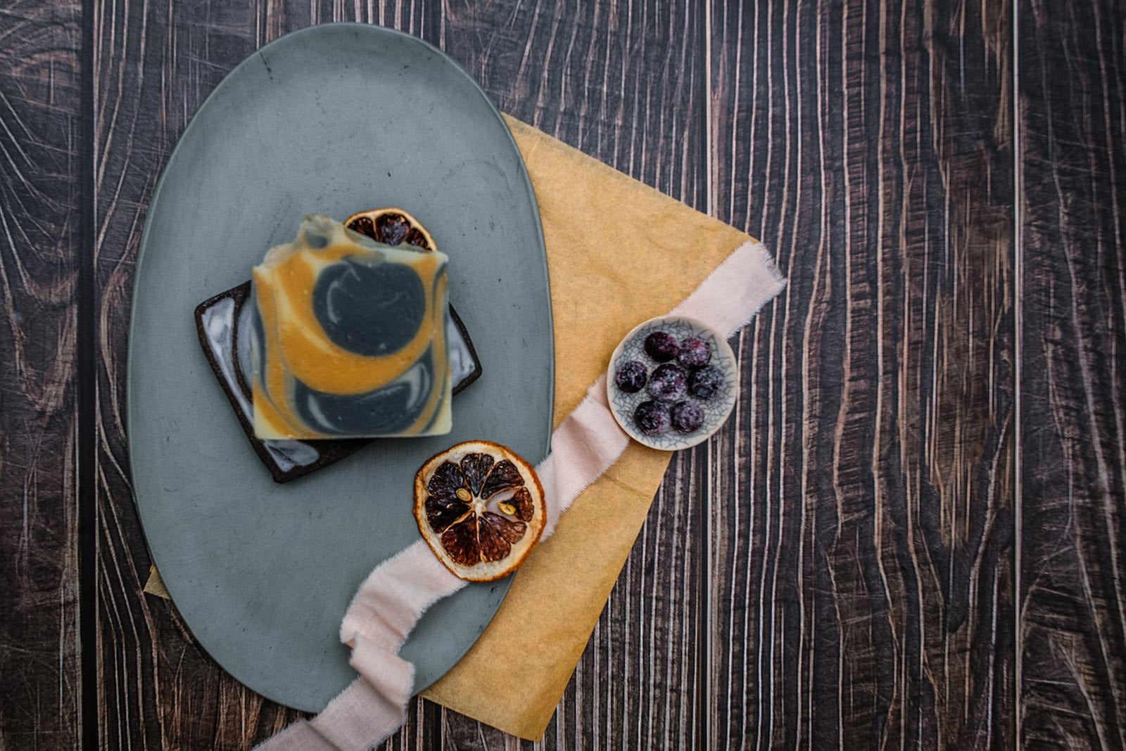 A vibrant bar made with bright, meyer lemon hydrosol and scented with sweet blueberry, this velvety soap is balanced with base notes of may chang and subtle hints of clove and thyme. Colored in playful layers of sea clay, indigo powder, and turmeric and topped with a dried slice of meyer lemon from our family tree. Aromatic notes of lemon curd, may chang, clove, thyme, and blueberry jam.