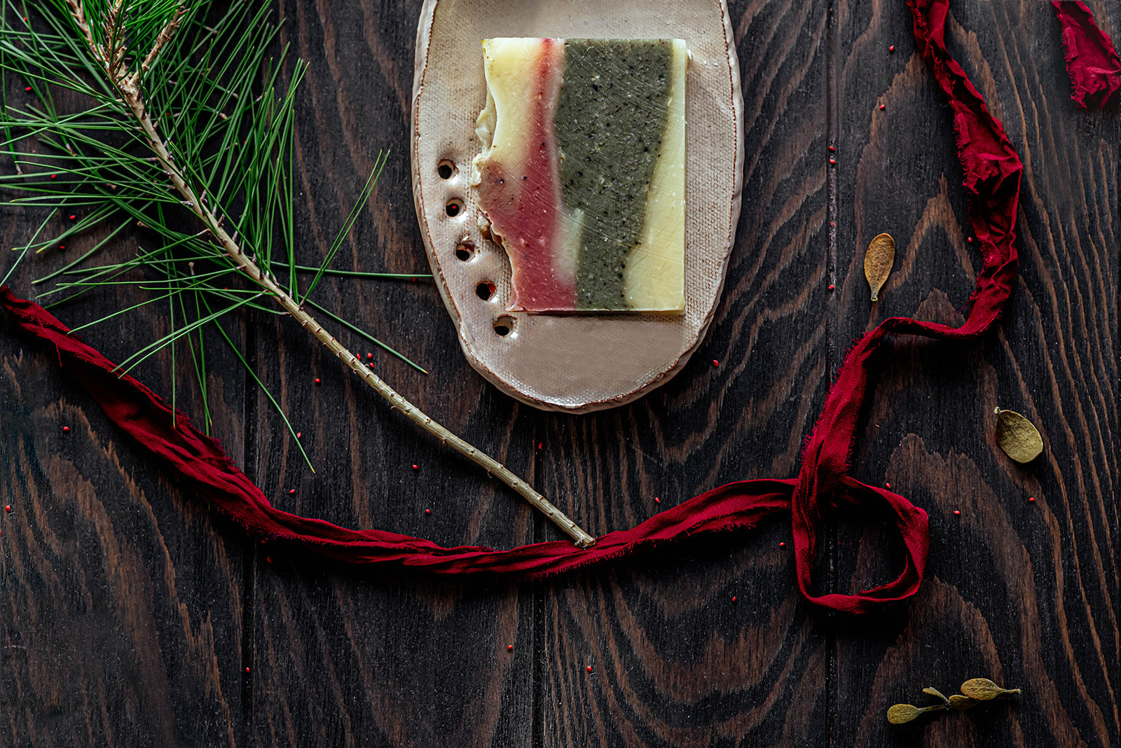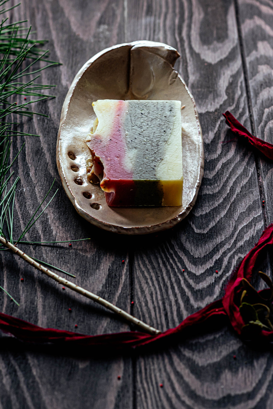 Often seen as a representation of strength and vitality, mistletoe* commonly graces the mighty oak here in North America and has long been used in winter solstice celebrations. We recognize her importance and longevity in surviving the dark, unforgiving winter months with this uniquely uplifting, vegan friendly soap. This soap offers a bright citrus body, an earthy dip into fir needle and pine, with a sweet finish of cranberry and red apple. Each bar contains scrubby cranberry seeds, a nourishing dose of hemp seed oil, and organic cacao butter. Aromatic notes of red apple, pine, clove, wood, sweet orange, cranberry, and almond.