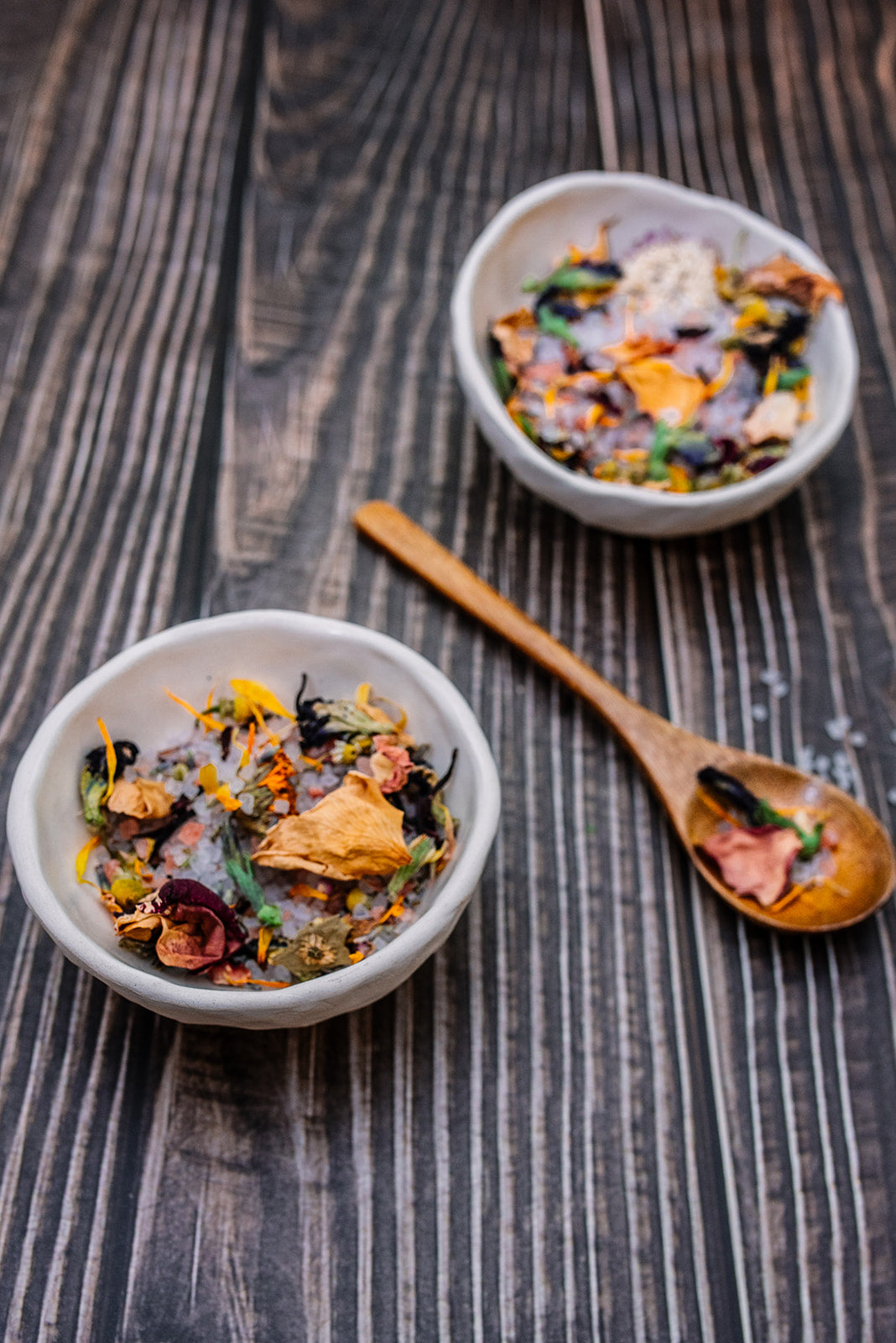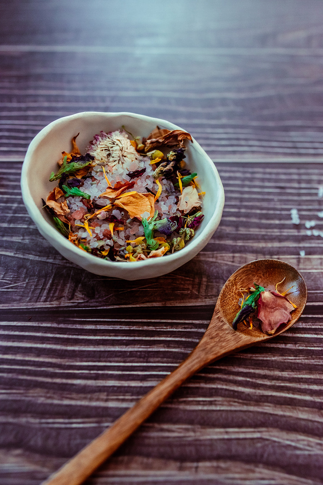 INGREDIENTS: pacific sea salt (sodium chloride), himalayan pink salt, hand harvested rose petals (rosa centifolia)+, calendula petals (calendula officianalis)+, chamomile (matricaria recutita)*, butterfly pea blossoms (clitoria ternatea)+, manzanita blooms (arctostaphylos)+, chrysanthemum flowers (chrysanthemum morifolium)*, hibiscus petals (hibiscus sabdariffa)*, lavender buds (lavandula angustifolia), dried orange